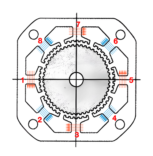 Mark the 8 poles of the stator counterclockwise as 1-8 # in sequence. Mark the first tooth of the first pole as stator tooth 1 and mark it counterclockwise in sequence. The rotor teeth corresponding to stator tooth 1 are labeled as rotor tooth 1, and are marked counterclockwise in sequence. Align the first pole with the rotor teeth exactly, as shown in Figure 2.
