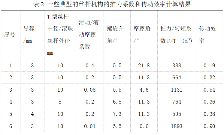Using typical parameter values in these formulas allows us to calculate the thrust coefficient and transmission efficiency for common screw mechanisms, as summarized in Table 2.