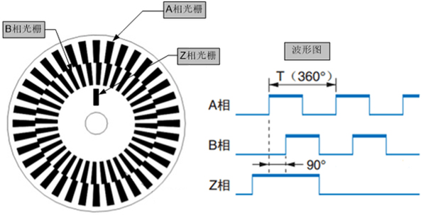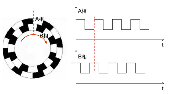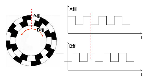 2. Direction. Adding another set of gratings with a phase difference of 90 ° (electrical angle) can achieve this goal (two gratings can be integrated on a disk, as shown in Figure 2). It is not difficult to observe that when rotating clockwise (Figure 3), the rising edge of the A-phase signal (low high level, or dark bright) always corresponds to the high-level state of the B-phase (bright); Conversely, when rotating counterclockwise (Figure 4), the falling edge of the A-phase signal always corresponds to the high-level state (bright) of the B-phase. This way, the direction of rotation can be determined.