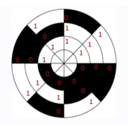 What if we want to determine position information without relying on zeros, we need to use an absolute value encoder. The principle is also very simple, if we make the "shape" (or encoding) of each subdivision interval of the entire circumference different. The absolute value encoder shown in Figure 5 has a concentric circle structure, where each concentric circle is called a code track. The disk is then divided into N equal parts, and 360 °/N is the accuracy of the absolute value encoder.