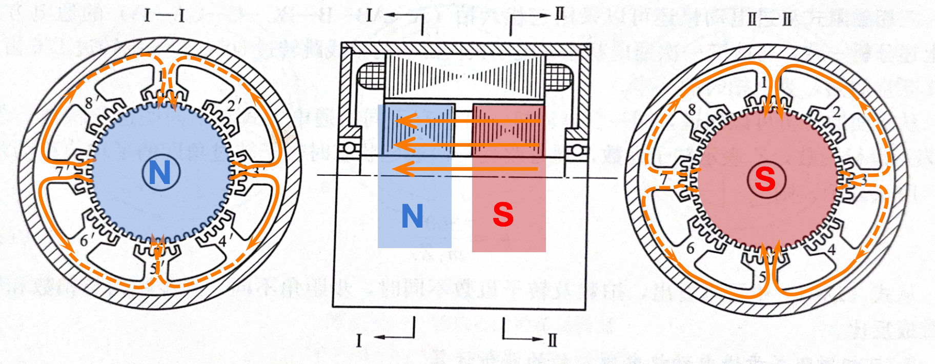 When a current is applied to the magnetized motor, the excitation magnetic field of the stator and the permanent magnetic field of the rotor interact, forming a new magnetic circuit. As shown in Figure 4, first observed from side (II), the magnetic field lines start from poles 1 and 5 (N pole) and enter the S pole rotor through the air gap between the aligned fixed rotor teeth. The magnetic field lines enter the S pole of the permanent magnet along the axial direction inside the rotor, and then exit from the N pole and enter the N pole rotor.