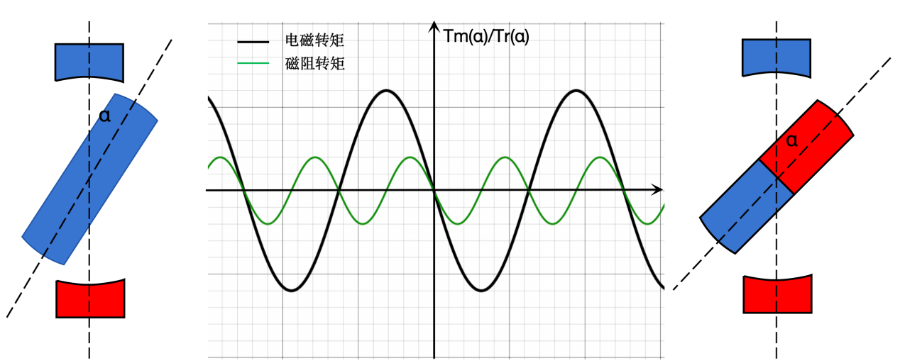 Reluctance torque is produced solely by the salient-pole structure. To study reluctance torque, electromagnetic torque must be excluded by using an unmagnetized rotor. Periodic changes in air-gap reluctance between stator and rotor teeth generate periodic reluctance torque. For salient-pole structures, reluctance torque follows a trigonometric pattern with half the period of electromagnetic torque, understandable via a simple two-pole salient model.