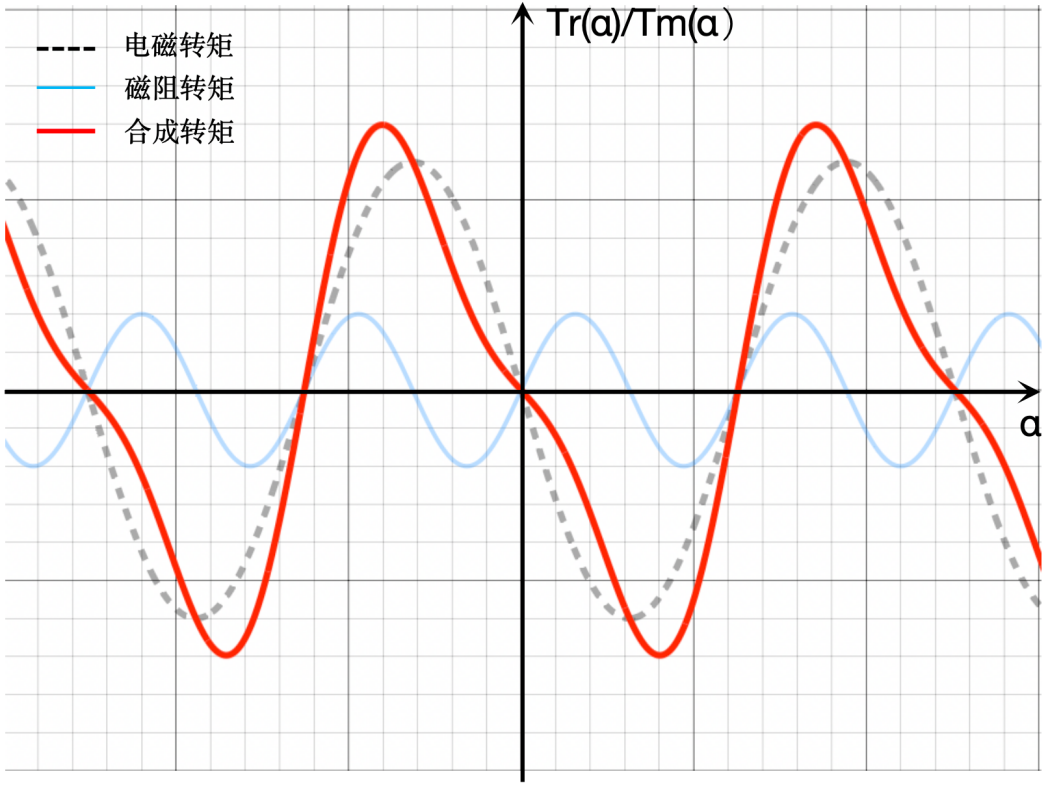where Tr = reluctance torque, T′′ = maximum reluctance torque, α = rotational angle (electrical angle), one step angle = π/2 electrical radians. The waveforms of electromagnetic torque, reluctance torque, and their combination are shown in Figure 4.