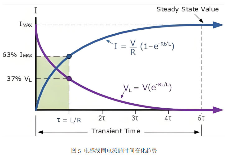 Here, L/R is known as the time constant, which determines how quickly the current rises. Take a typical stepper motor as an example: phase resistance R = 9 Ω, phase inductance L = 18 mH. The time constant τ = L/R = 2 ms. This means it takes 2 ms for the current to reach 63% of its steady-state value, and about 6 ms (3τ) to reach 95%.